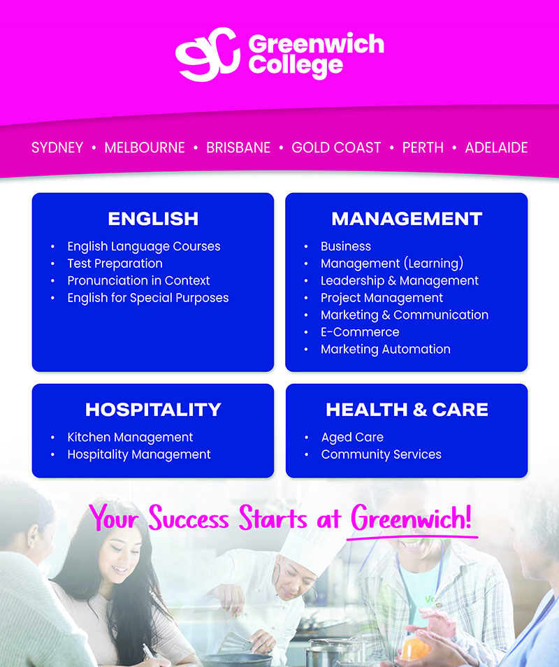Greenwich College, Avustralya'nın en büyük şehirlerinde kampüsleri bulunan, öğrencilere kaliteli eğitim ve çeşitli fırsatlar sunan bir eğitim kurumudur. Adelaide, Brisbane, Gold Coast, Melbourne, Perth ve Sydney gibi altı büyük şehirdeki kampüslerinde, dünya çapında tanınan Cambridge programlarını sunan en büyük sağlayıcılardan biridir. Her yıl 1000'den fazla mezun vererek, öğrencilerine başarılı bir kariyer için güçlü bir temel sağlar.